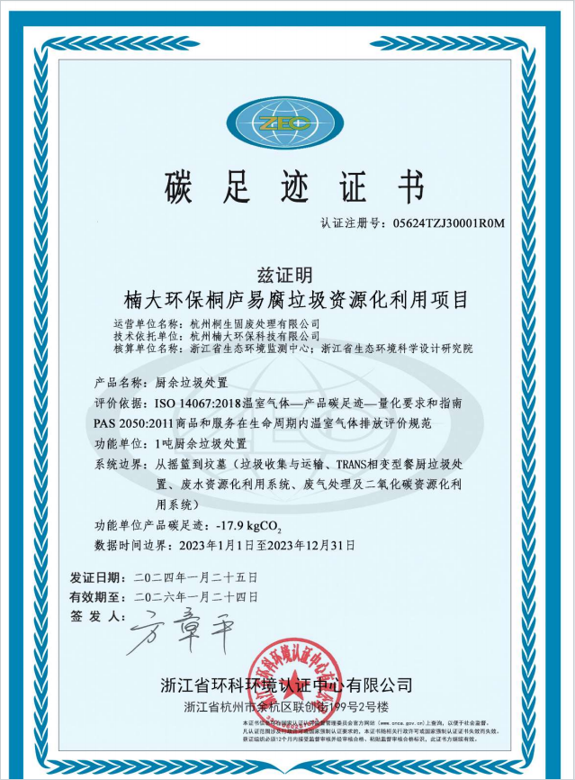 桐庐易腐垃圾处置项目碳足迹证书
